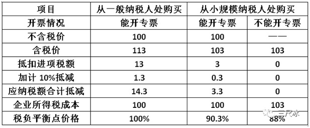 結(jié)論:在能取得增值稅專用發(fā)票的情況下,小規(guī)模納稅人的含稅價應(yīng)該比一般納稅人便宜3.3元(價格為一般納稅人價格的96.9%);價格高于96.9%,從一般納稅人處購買更合算,反則反之。如果小規(guī)模納稅人不能開專票,小規(guī)模納稅人的含稅價應(yīng)該比一般納稅人便宜5.85元(價格為一般納稅人價格的94.5%);價格高于94.5%,從一般納稅人處購買更合算,反則反之。